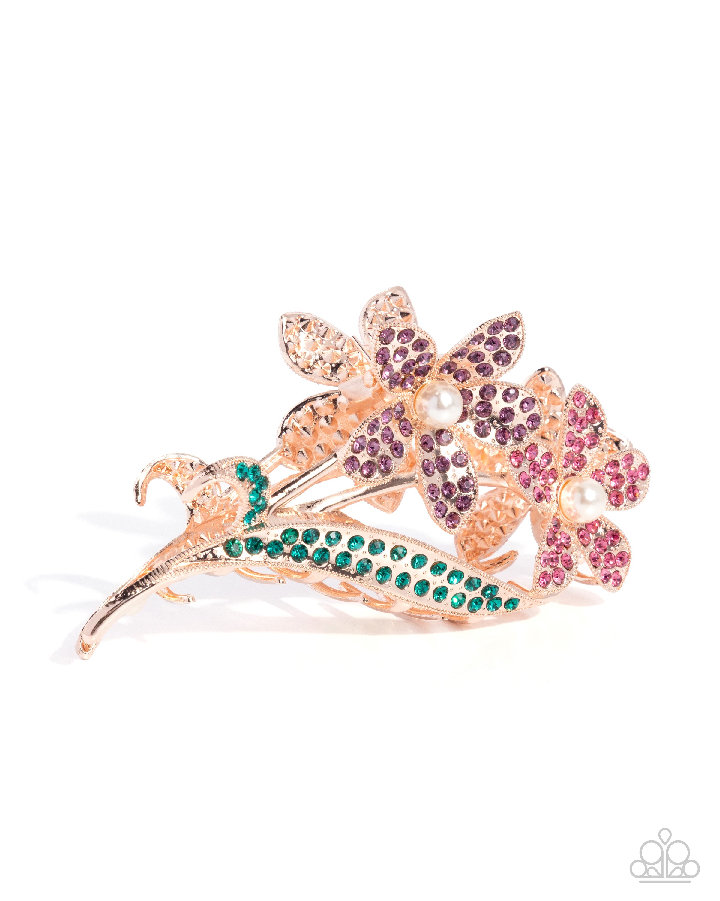 Featuring white pearl centers, a duo of rose and light amethyst rhinestone-dotted rose gold flowers bloom from a green rhinestone-embellished rose gold stem atop a glistening rose gold claw clip, holding the hair away from the face for an on-the-go Spring-inspired display. Clip measures approximately 4" in length and 2" in width.
