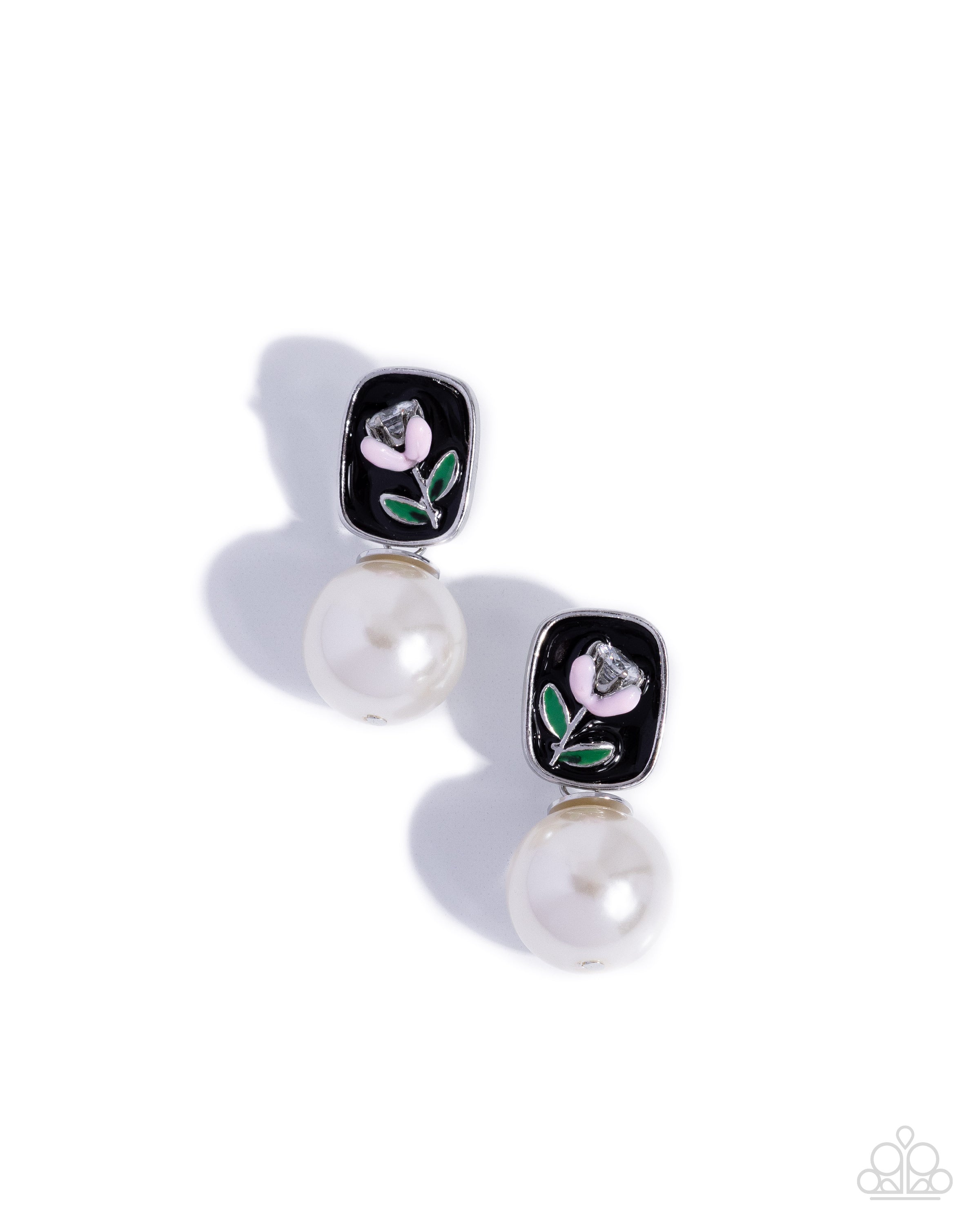 Featuring a black-painted backdrop, a baby pink flower with a white gem center and green leaves blooms atop the ear, giving way to an oversized, glossy white pearl for a polished, poised display. Earring attaches to a standard post fitting.