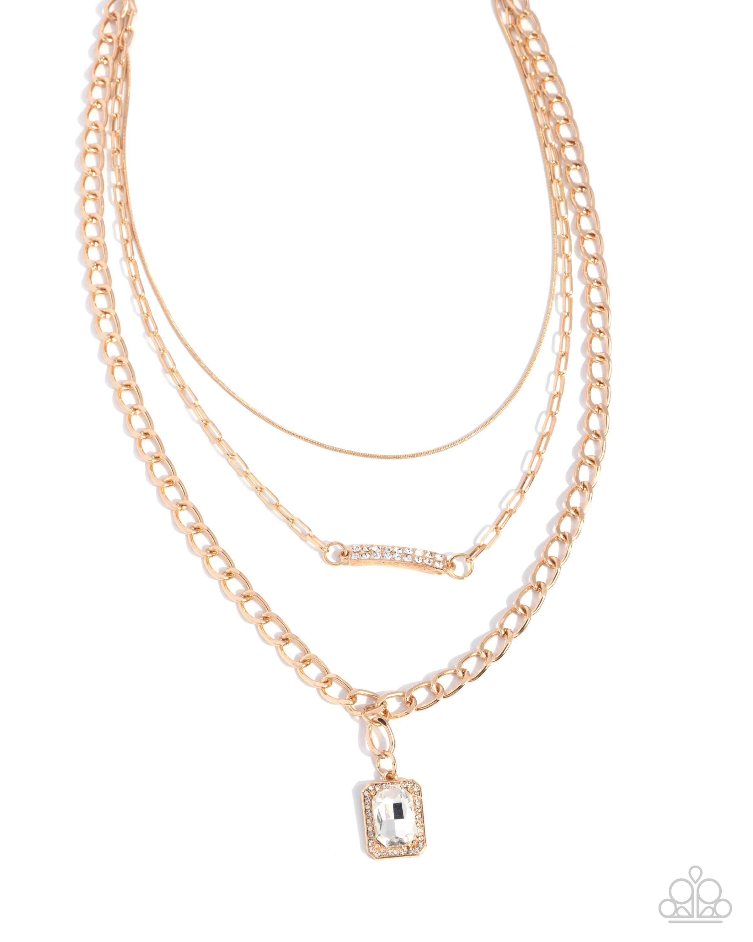 Shimmery mismatched gold dainty snake, curb, paperclip chains layer and cascade below the collar. Pressed in a white rhinestone-embellished frame, an emerald-cut white gem is centered below the lowermost chain, while a curved gold bar with rows of white rhinestones is featured along the center of the middlemost chain for a shimmery standout finish. Features an adjustable clasp closure.