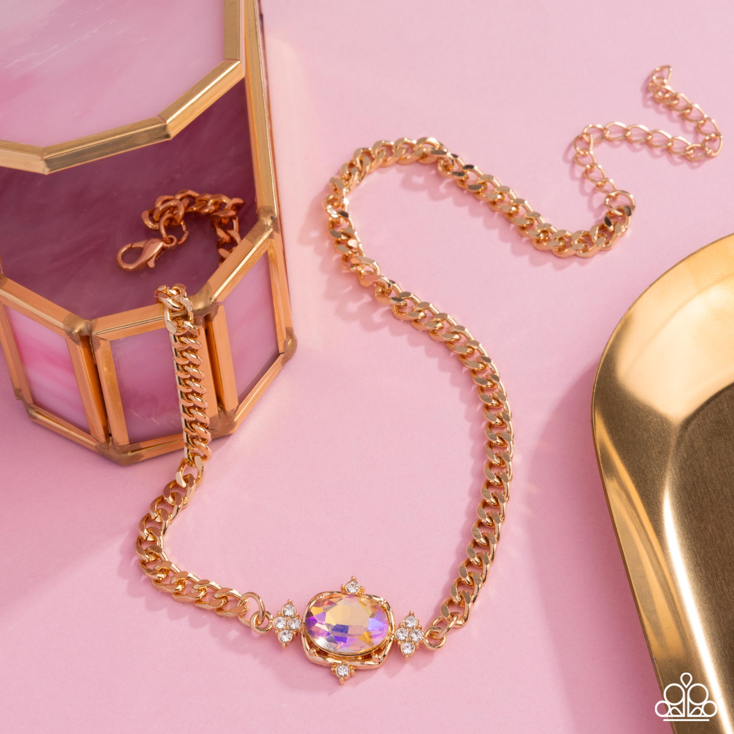 Featuring a yellow UV-shimmery gem, an oval gem is pronged and centered along a gold curb chain beside dainty white rhinestones for a pop of majestic color below the neckline. Features an adjustable clasp closure.