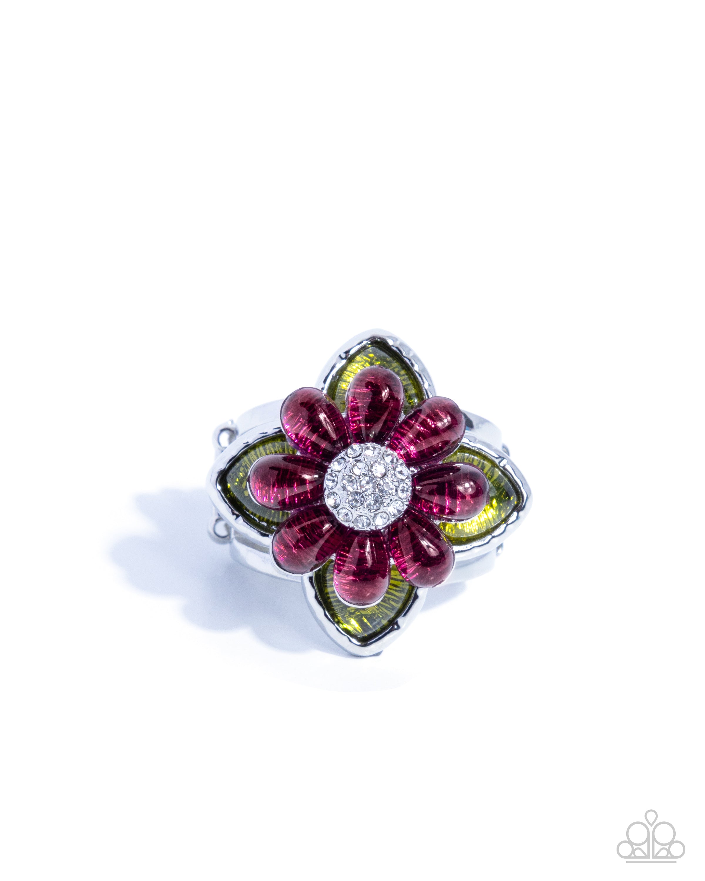 Layering around a white rhinestone-embellished silver center, a collection of glossy plum teardrop petals and spade transparent olive petals in hammered silver fittings blooms atop the finger for a whimsical pop of color and flair. Features a stretchy band for a flexible fit.