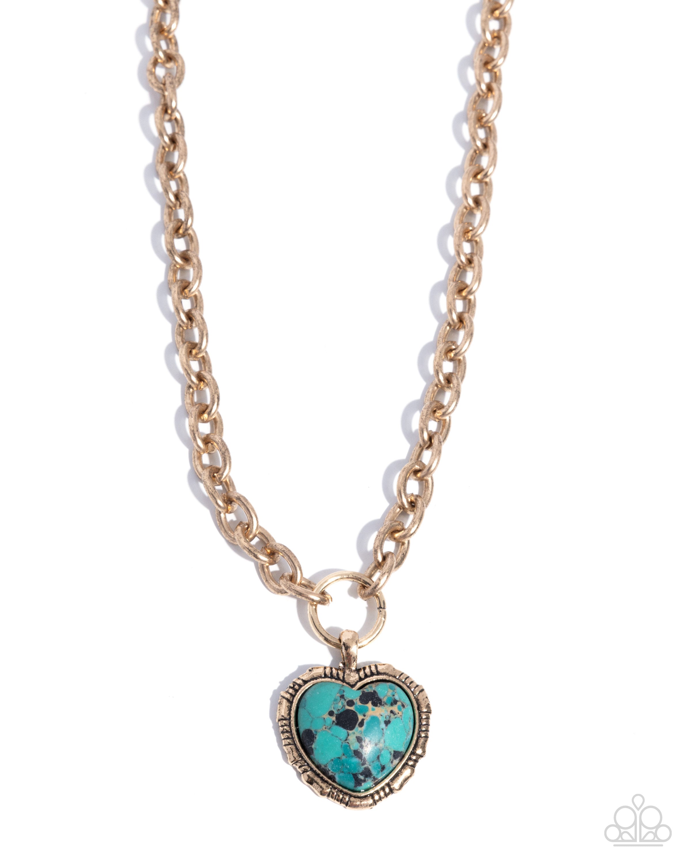Pressed in a textured antiqued gold heart frame, a green-marbled stone sits at the center of a burnished thick antiqued gold cable chain for an eternally earthy display. Features an adjustable clasp closure. As the stone elements in this piece are natural, some color variation is normal.