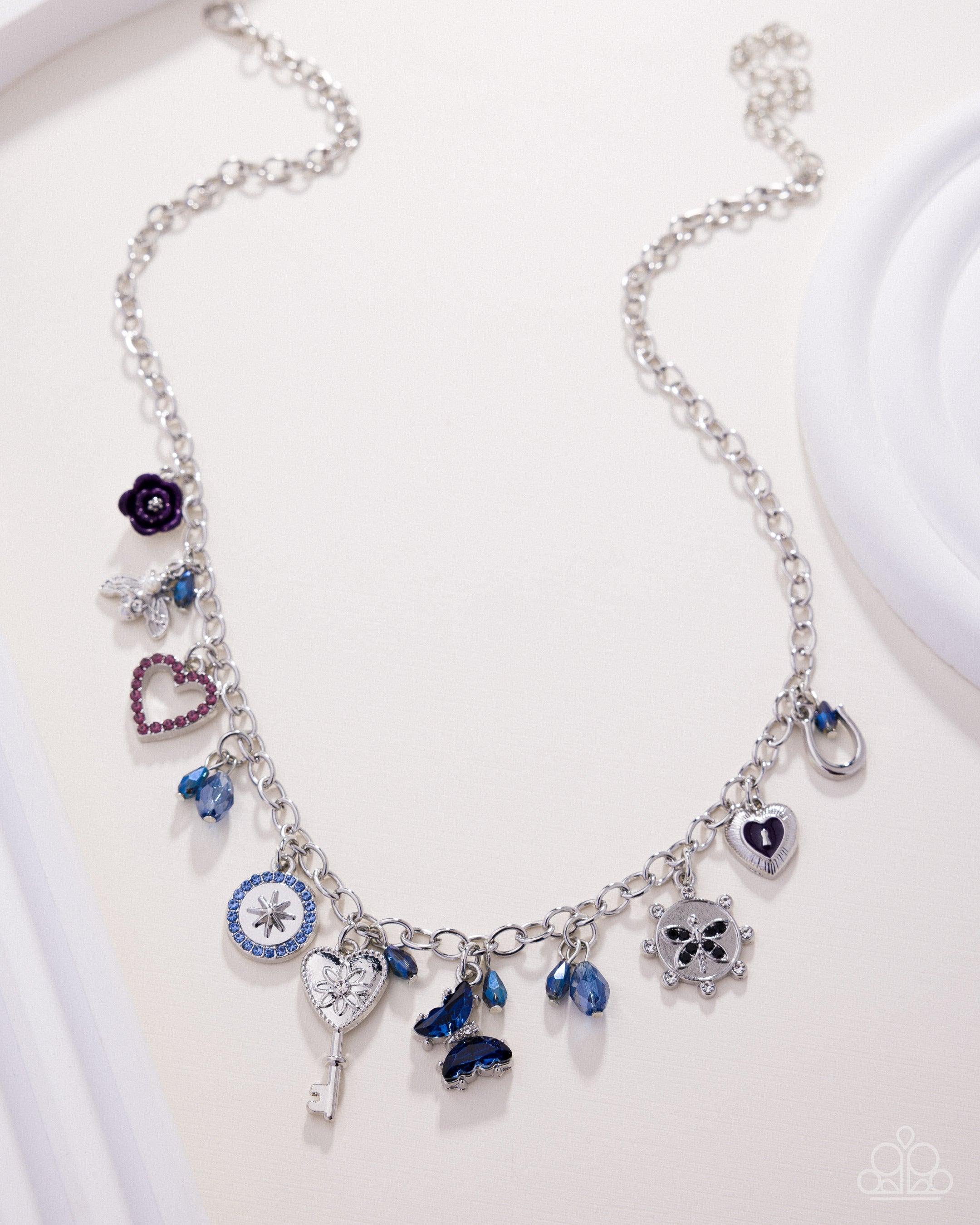 Swaying along a silver curb chain, a collection of eclectic vintage silver charms including a Plum three-dimensional flower, a pearl-dotted bee, a light amethyst rhinestone heart silhouette, faceted blue gem beads, a light sapphire rhinestone-dotted disc with a silver star center, a floral-dotted silver key, a Montana gem butterfly, a rhinestone-dotted dragonfly pendant complete with a rhinestone dotted border, a Plum-painted sunburst textured heart, a silver horseshoe cascades below the neckline for a one-of-a-kind display. Features an adjustable clasp closure.