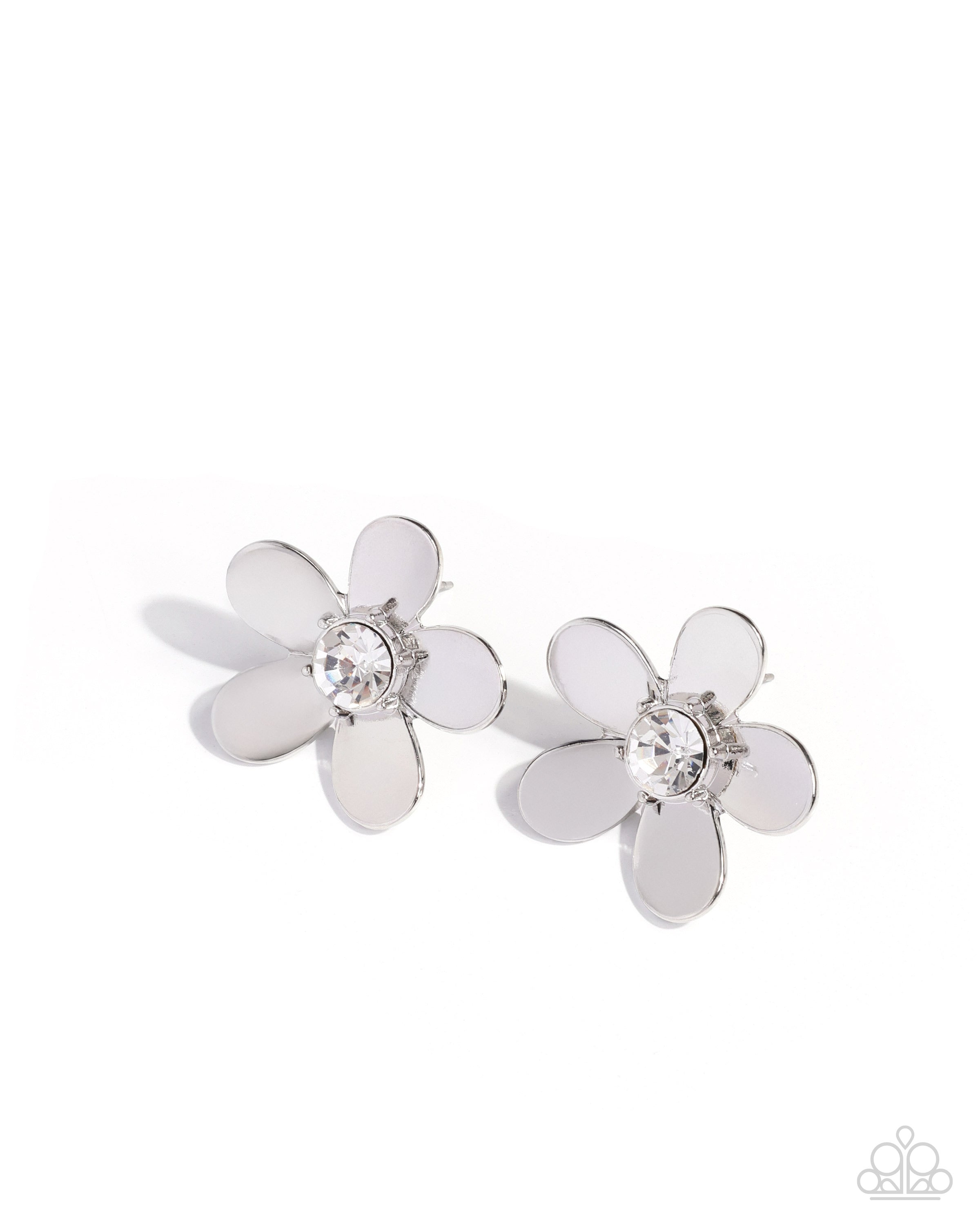 Delicate smooth silver petals radiate out from a sparkling white rhinestone center. The playful and polished aesthetic adds a touch of whimsy to any look. Earring attaches to a standard post fitting.