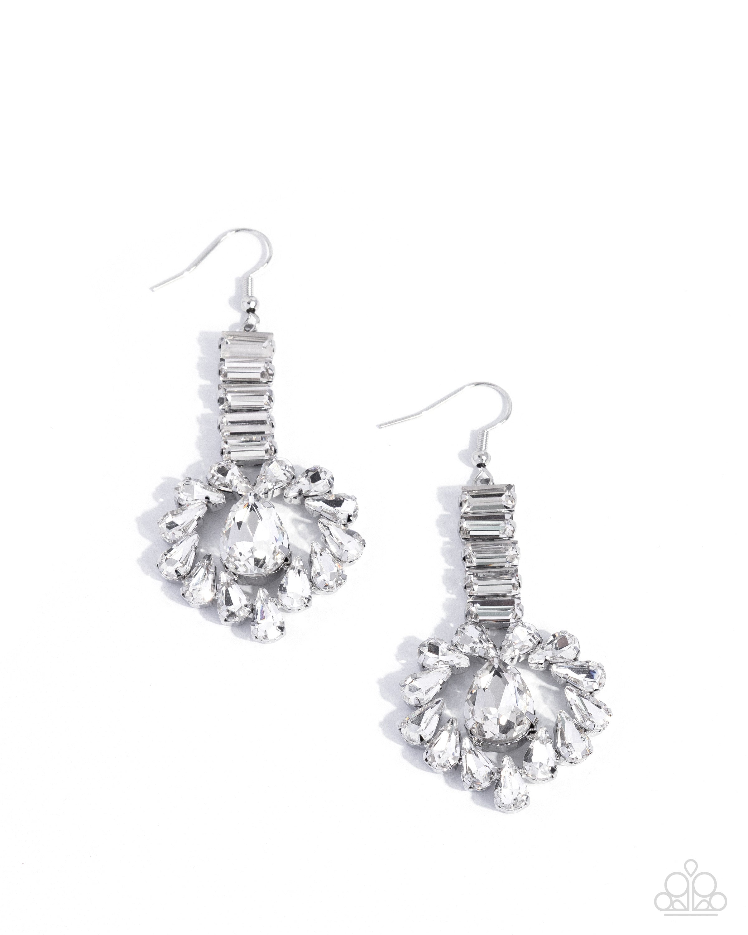 Pronged in silver fittings, a collection of white teardrop gems coalesces below the ear into a radiantly romantic heart from a quintet of emerald-cut white gems, showcasing an oversized white teardrop gem in the center of the heart for a shimmery finish. Earring attaches to a standard fishhook fitting.