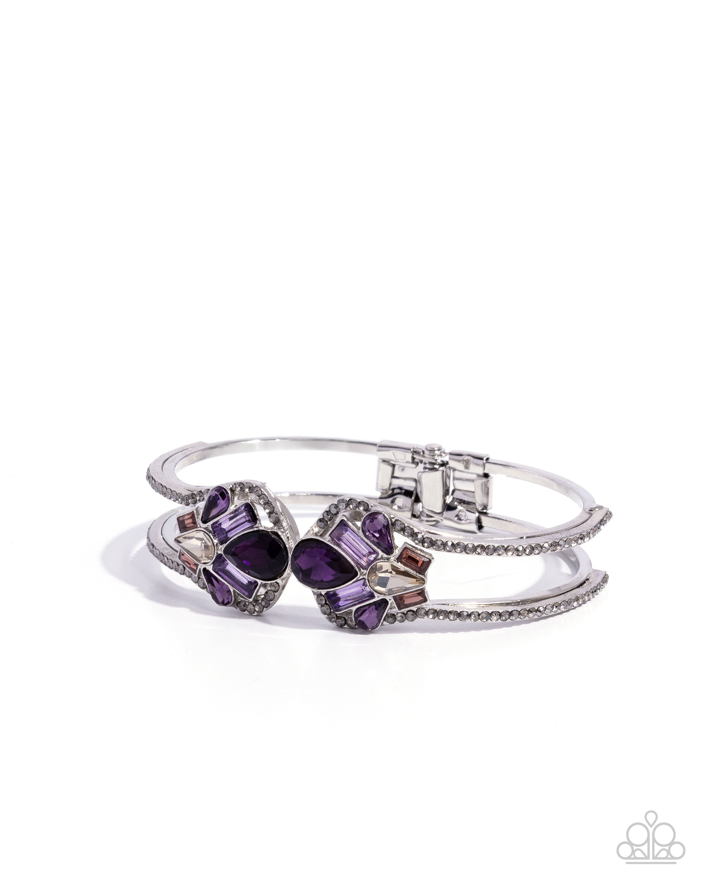 Lined with smoky rhinestones, a clustered collection of purple gems in teardrop and emerald cuts, peach gems in emerald cuts, and a champagne teardrop gem graces the ends of airy silver bars of an airy silver cuff, creating a glamorously glitzy look.