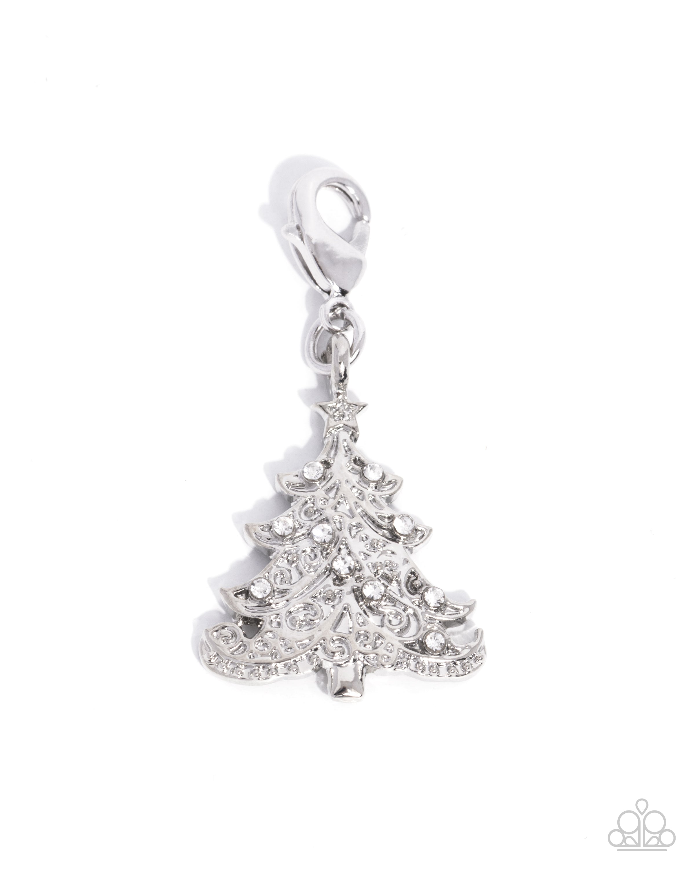 Featuring a high-sheen Rhodium dip, a white rhinestone-embellished, layered silver Christmas Tree reflects light in every direction. Features a clasp closure. Can be attached to a variety of chains for a Winter-inspired design. Charm measures approximately 3/4" in length. Bracelet not included.