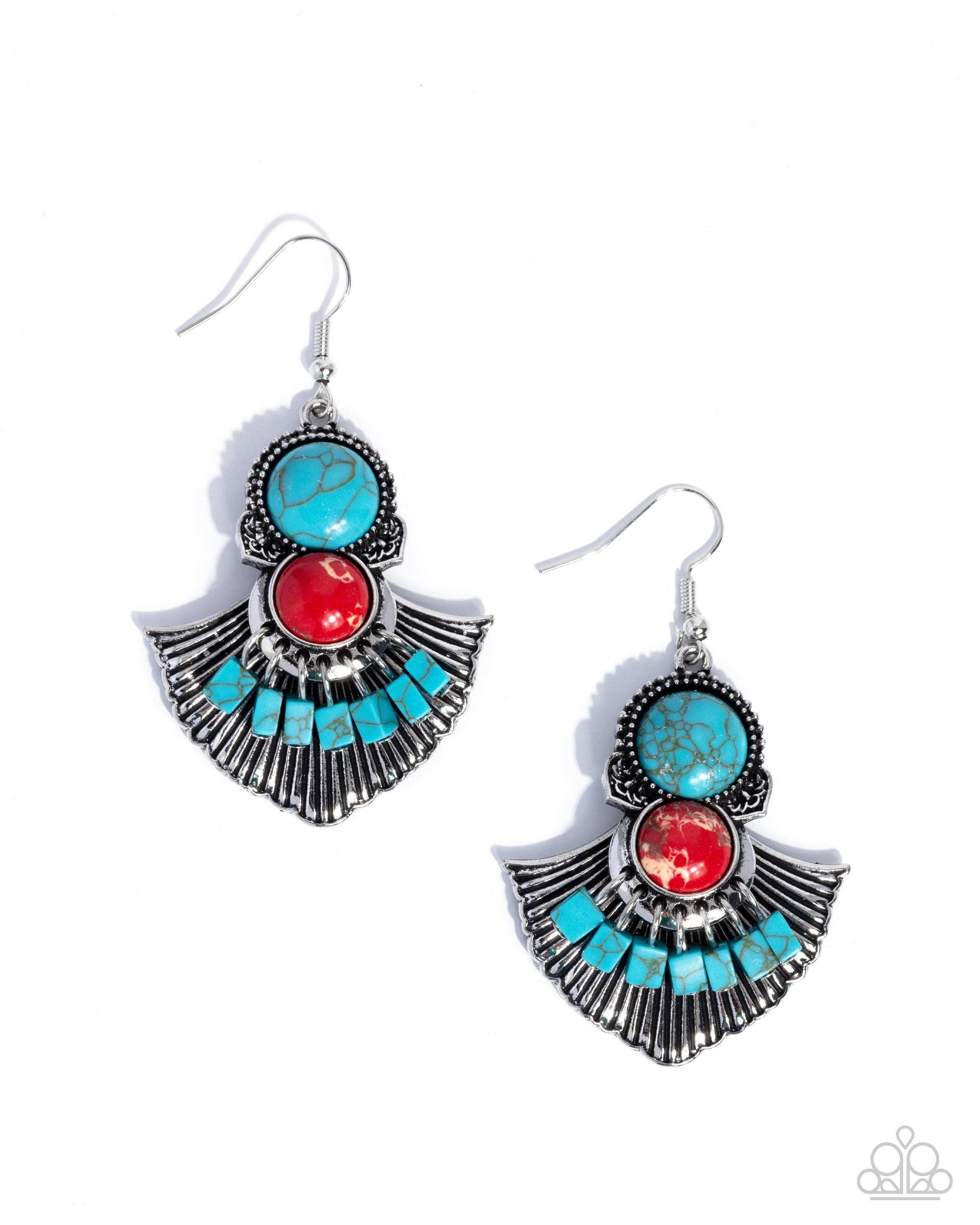 Featuring a marbled effect, a round turquoise stone is pressed in a silver-studded frame, while shiny silver spades fan out underneath it, leading the eye to its interconnected red-marbled stone in a sleek fitting. Suspended against a crimped, flared silver backdrop, a collection of turquoise-marbled square stones sways below the red-marbled stone for a finishing touch of daring color. Earring attaches to a standard fishhook fitting. As the stone elements in this piece are natural, some color variation is normal.