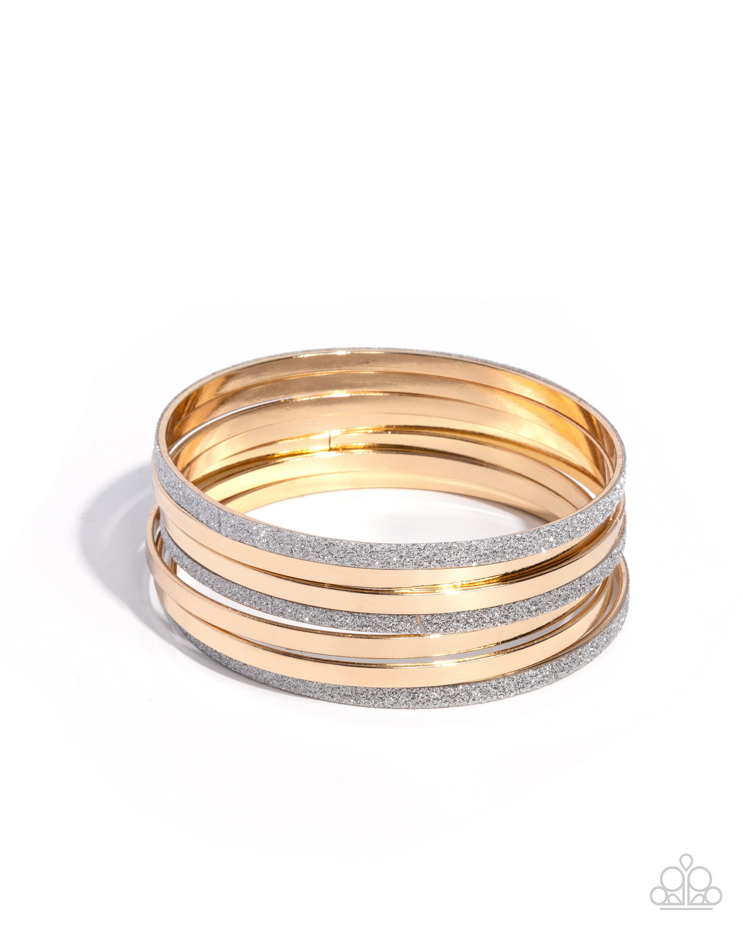 Featuring smooth and silver glitter-dusted surfaces, mismatched gold bangles stack across the wrist for a confidently casual look.