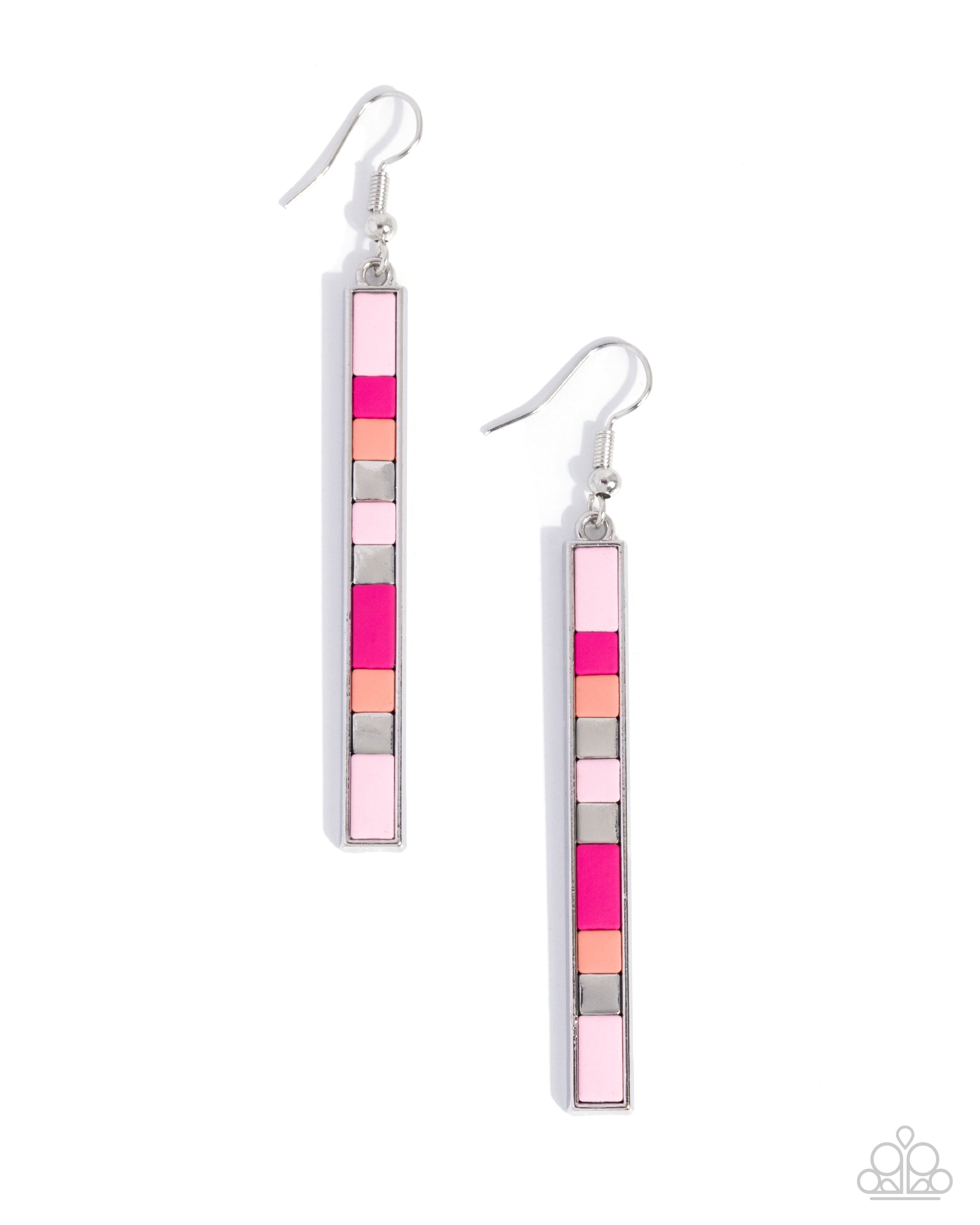 Pressed in a rectangular silver fitting, a collection of silver squares, and clay baby pink, Pink Peacock, and Burnt Coral squares patterns below the ear for a colorblock-inspired display. Earring attaches to a standard fishhook fitting.