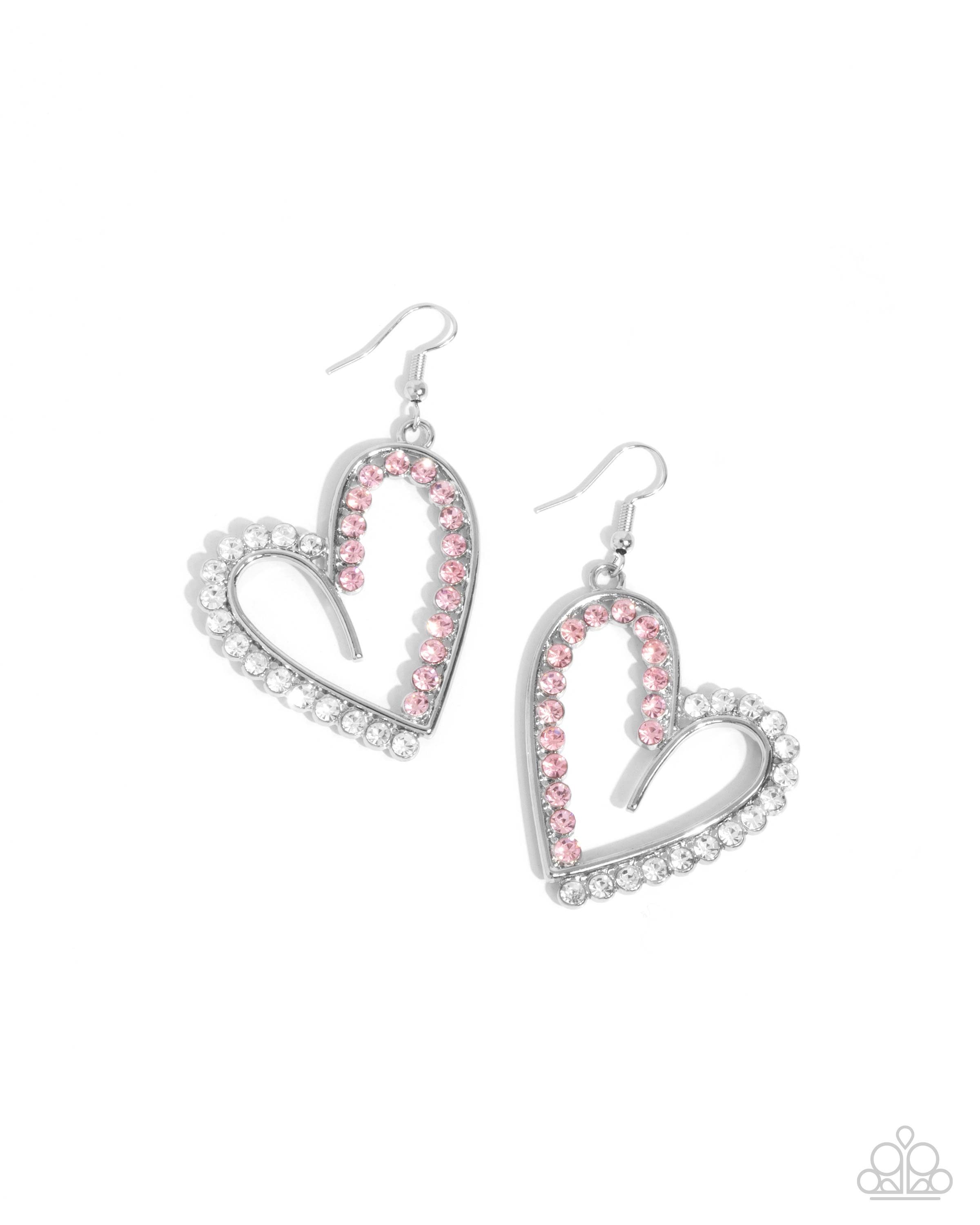 Curving along the inner circumference on one side of an abstract silver heart frame, a collection of dainty light rose rhinestones glistens. Dainty white rhinestones curl around the opposite side on the outer circumference of the heart frame, creating an attention-grabbing romantic statement below the ear. Earring attaches to a standard fishhook fitting.