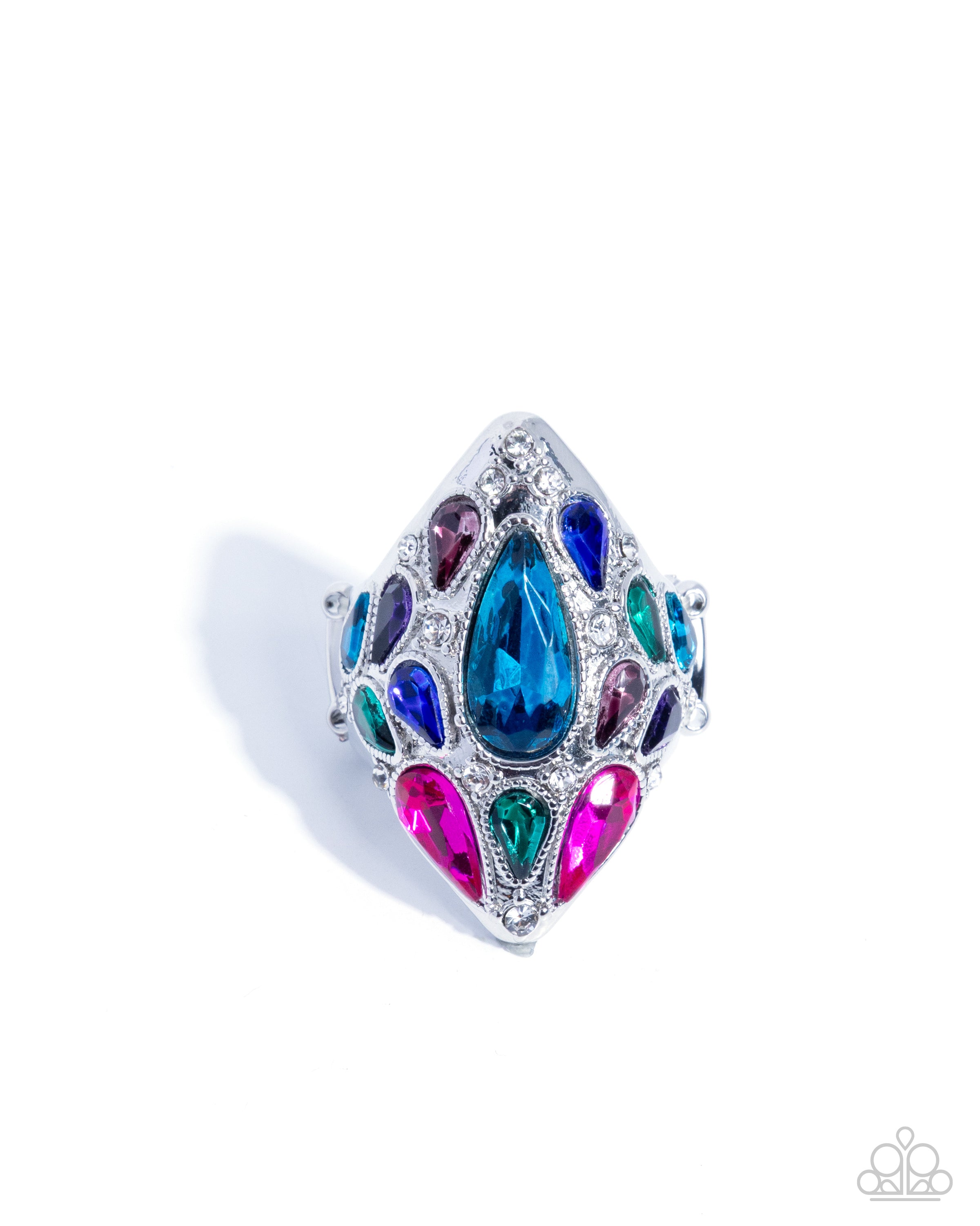 Embedded atop an abstract, silver-studded and white rhinestone-dusted frame, a faceted collection of multicolored teardrop gems in varying sizes dramatically fans out atop the finger, creating an explosion of high sheen. Features a stretchy band for a flexible fit.