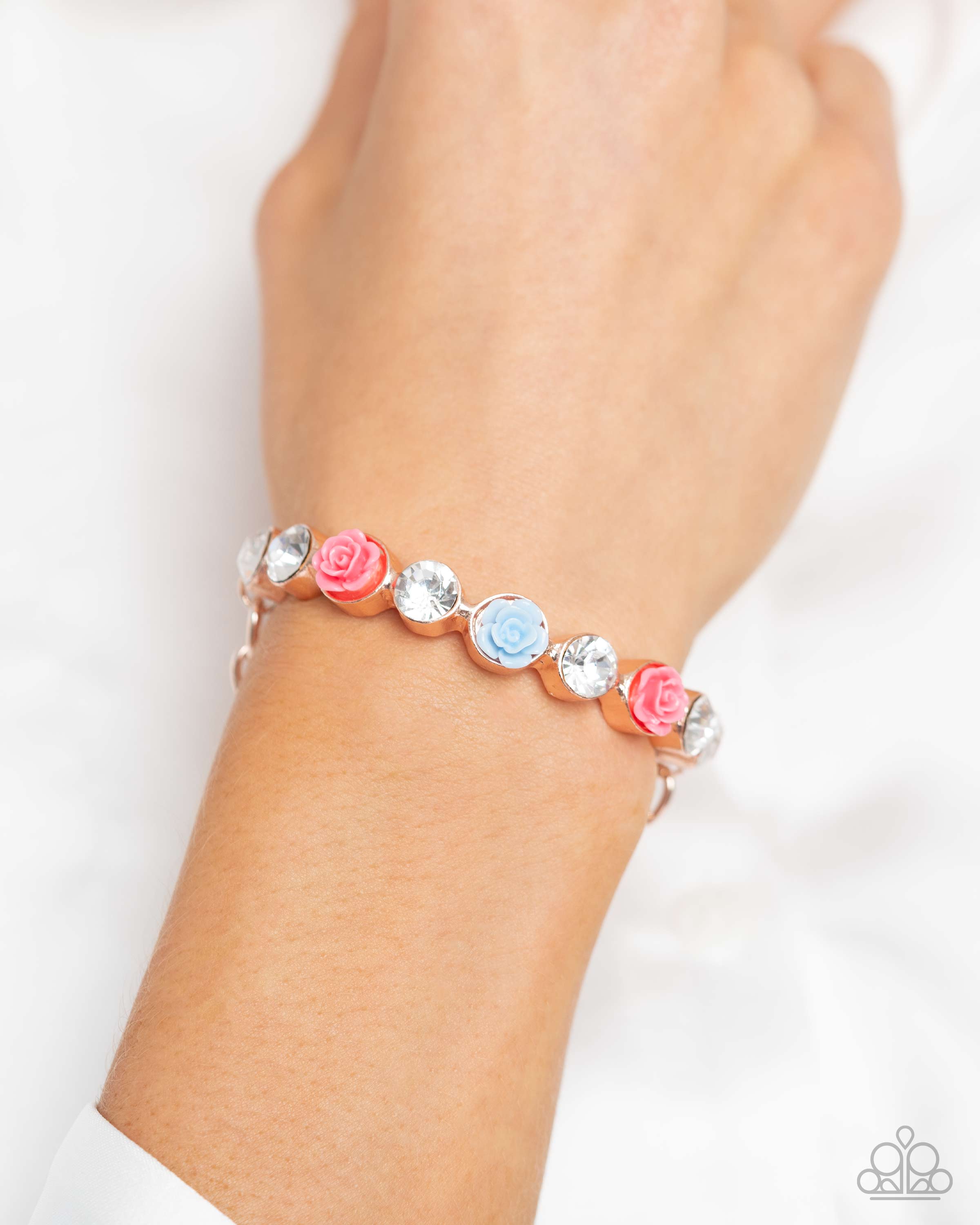 Pressed in bubbly rose gold fittings, a collection of Desert Rose and Winter Sky rose acrylics join white rhinestones along the wrist, connecting to rose gold curb chain links for a whimsically wondrous display. Features an adjustable clasp closure.