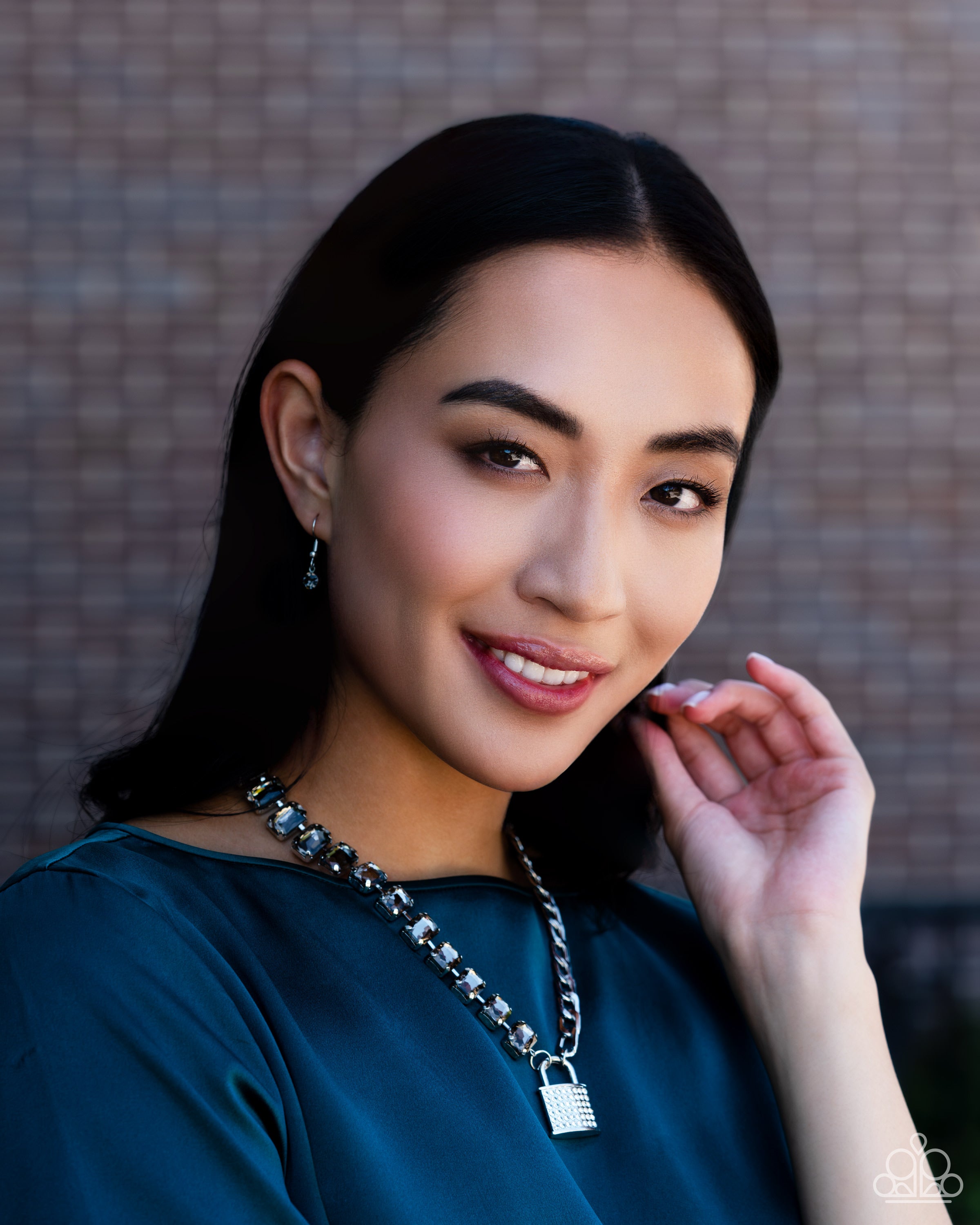 Infused on a classic silver chain, a strand of thick silver curb chain, and a collection of exaggerated, smoky radiant-cut gems in silver pronged fittings combine to create a collision of industrial color around the neckline. An oversized silver lock charm, embossed in white rhinestones, dangles from the gritty display for a touch of soft glitz to the design. Features an adjustable clasp closure.