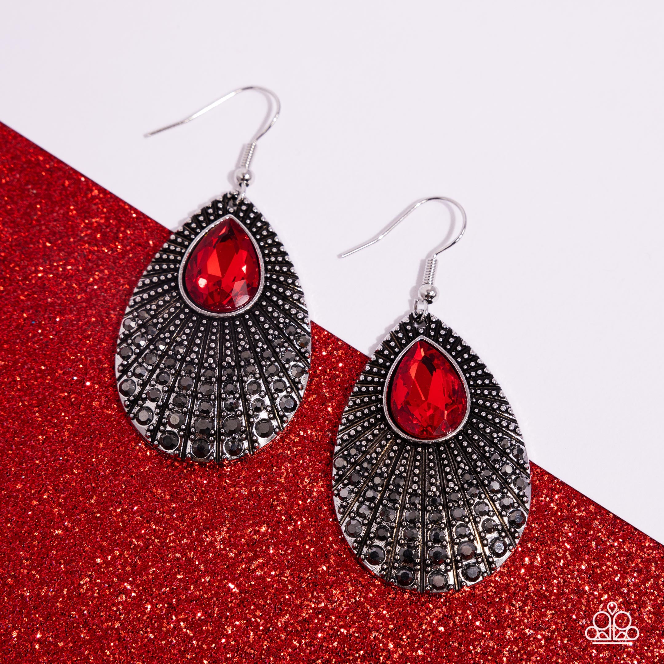 An oversized red teardrop rhinestone is pressed into a rustic silver teardrop. Radiating with dainty silver studs, the bottom of the gritty lure is dotted in rows of hematite rhinestones for a glittering finish. Earring attaches to a standard fishhook fitting.